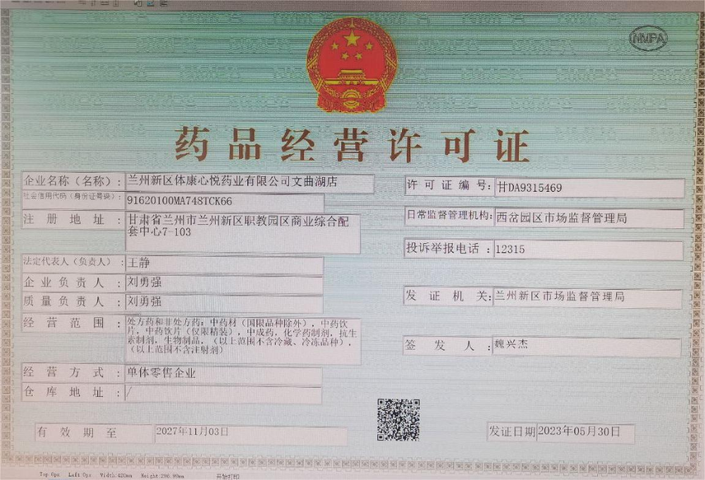 兰州新区体康心悦药业有限公司文曲湖店药品经营许可证-捕鱼网