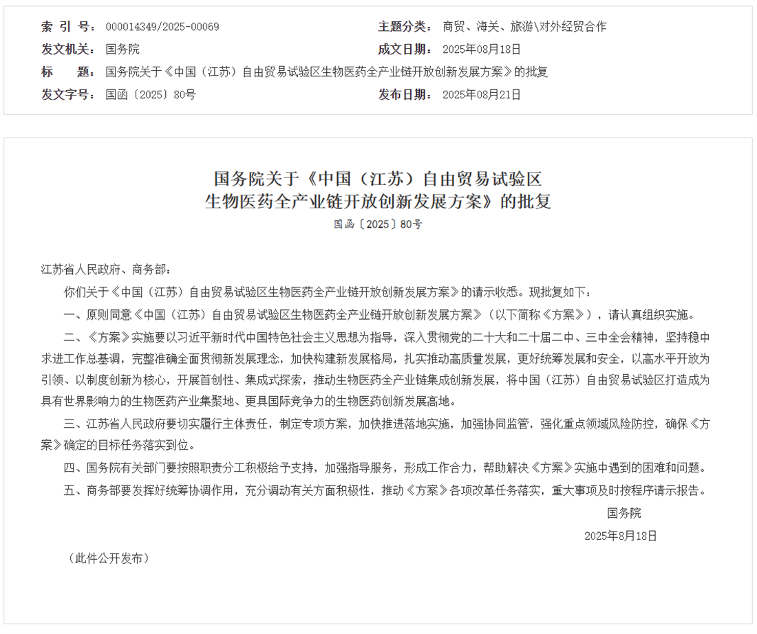 国务院批复同意《中国(江苏)自由贸易试验区生物医药全产业链开放创新发展方案》