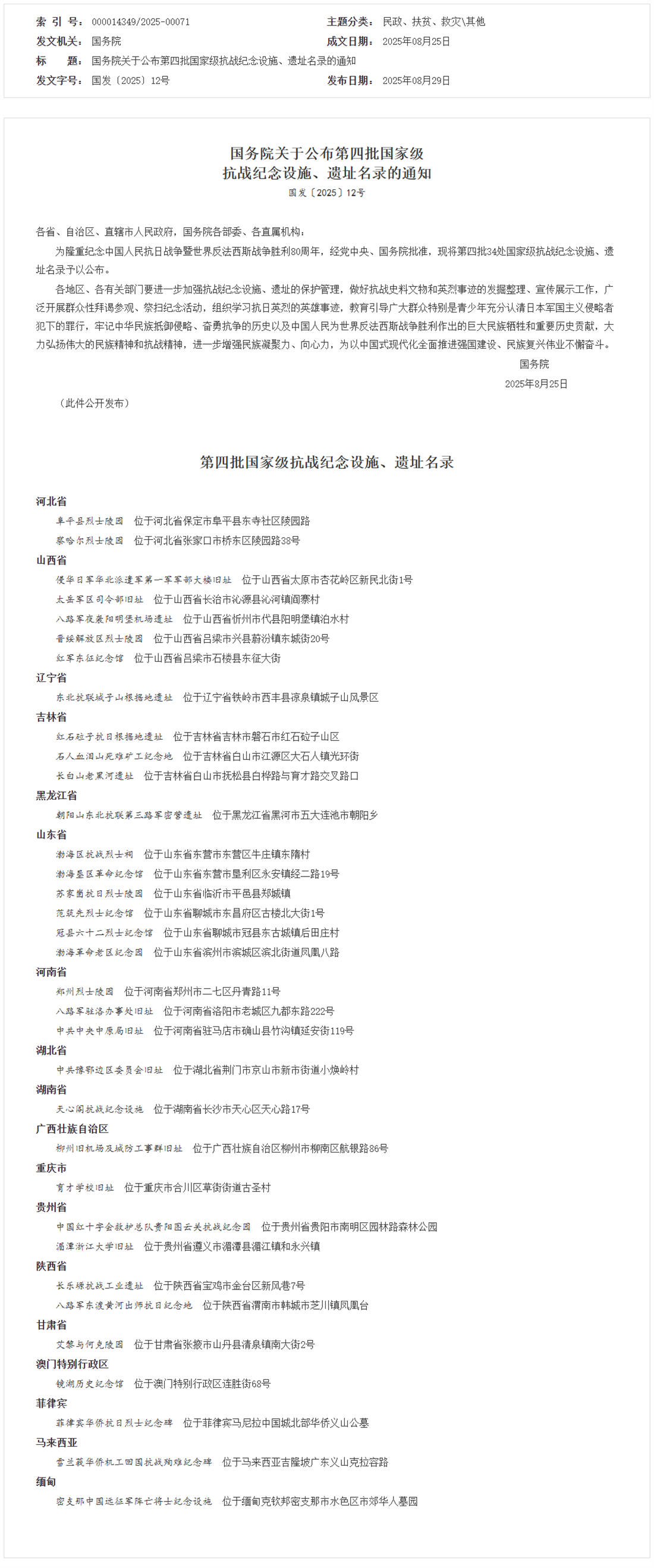 国务院公布第四批国家级抗战纪念设施、遗址名录