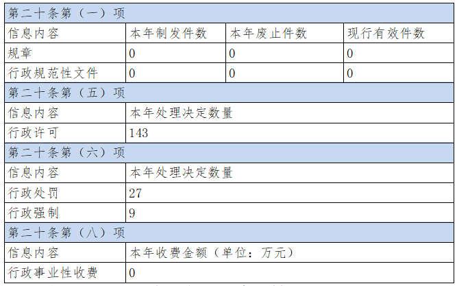 (一)主动公开政府信息情况。2022年,园区按照“公开为常态,不公开为例外”的总体要求,通过微信公众号、今日头条共计发布信息2500余条;通过“甘肃省政府采购网”中“甘肃省政府采购管理交易系统”主动公开政府采购合同信息30笔,采购金额合计447.36万元。通过政务大厅办理行政许可事项143项,办结率100%;依法开展行政处罚27件,行政强制9件。
