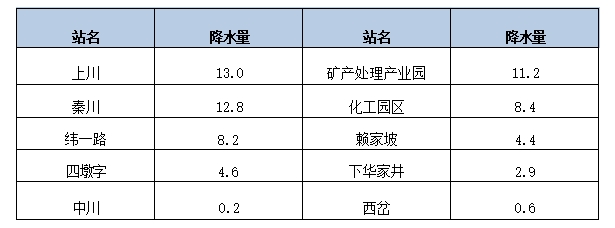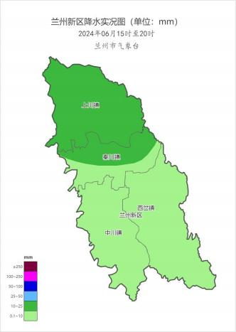 6月15日17时开始,兰州新区大部出现降水天气,截至15日20时,最大降水量(单位:毫米)出现在上川13.0,其次为秦川12.8、矿产处理产业园11.2、化工园区8.4、纬一路8.2,其他站点均在5.0毫米以下。