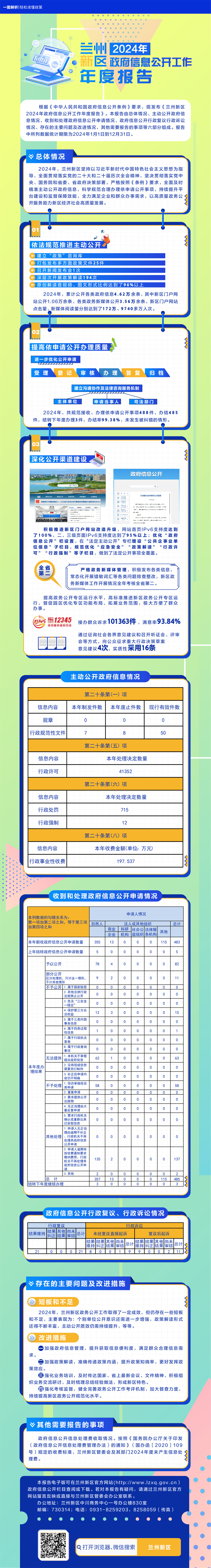 2024年,兰州新区坚持以习近平新时代中国特色社会主义思想为指导,全面贯彻落实党的二十大和二十届历次全会精神,坚决贯彻落实党中央、国务院和省委、省政府决策部署,严格按照《条例》要求,全面及时精准主动公开政府信息,科学规范合理办理依申请公开事项,持续提升平台建设和监督保障效能,全力满足企业和群众办事需求,以高质量政务公开服务助力新区经济社会高质量发展。