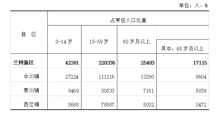全新区常住人口中,0-14岁[5]人口为42381人,占14.71%;15-59岁人口为220336人,占76.45%;60岁及以上人口为25483人,占8.84%;其中65岁及以上人口为17115人,占5.94%。