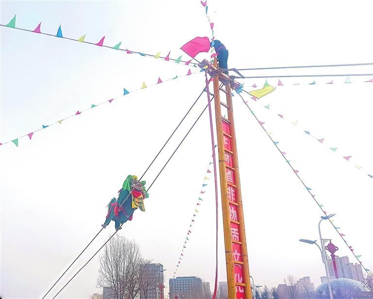 狮子登杆”是目前新区唯一一个省级非物质文化遗产。“引狮子”“狮子上软绳”“舞狮”等惊险刺激的高难度动作让观看群众屏息凝神,无不为其精妙绝伦且极具挑战性的表演所惊叹。