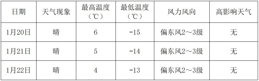 预计1月20至23日,受西北气流影响,新区天气以晴为主;24至25日,受冷空气和高原槽东移影响,新区有一次寒潮降雪天气;26日,受偏西气流影响,新区天气多云转晴。