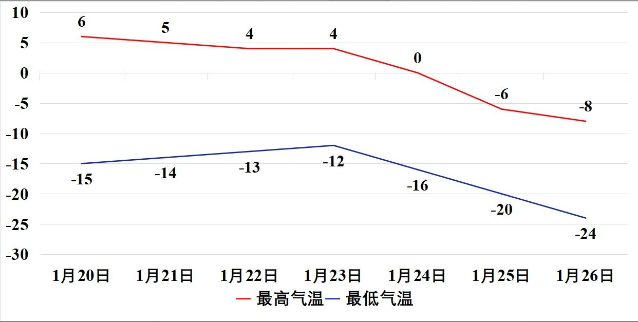 预计24至26日,全区将出现寒潮天气,最高气温累计下降12℃,最低气温累计下降12℃。26日新区最高气温-8℃,最低气温将出现在26日清晨,将降至-24℃(图2)。