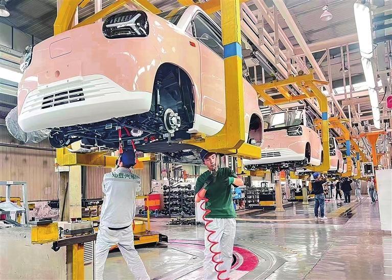 图为“知豆彩虹”新招聘的员工在组装车间工作。