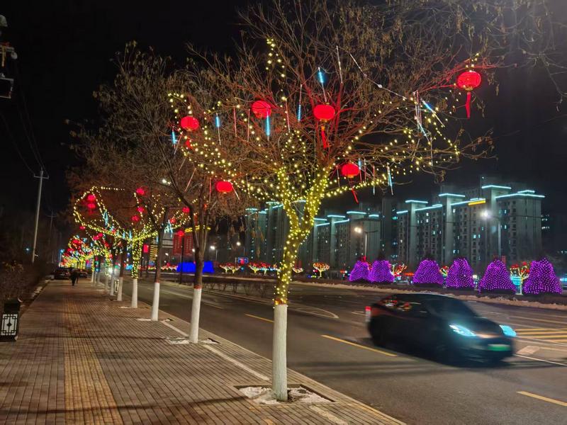 春节临近的傍晚,漫步在兰州新区街头,街道两侧的树上星星点点的彩灯像是满眼繁星,与万家灯火交相辉映,尽显流光溢彩,新区居民在家门口就能欣赏到灯景结合、色彩联动的城市夜景,切身感受红红火火的城市年味儿。