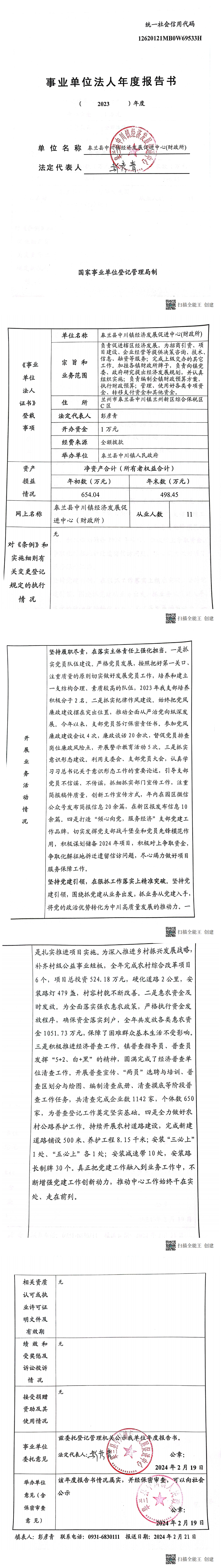 皋兰县中川镇经济发展促进中心(财政所)2023年度事业单位法人年度报告书-捕鱼网
