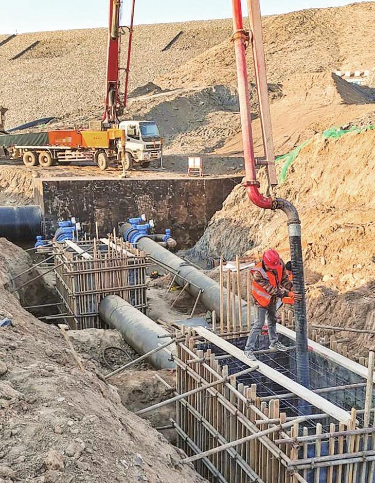 石门沟2号水库供水管道工程施工现场,各种机械配合工人正在忙碌地进行管沟开挖、管道铺设、焊接、试压等工序。项目实施后可进一步优化新区水资源配置,提高新区生活工业用水保障率。