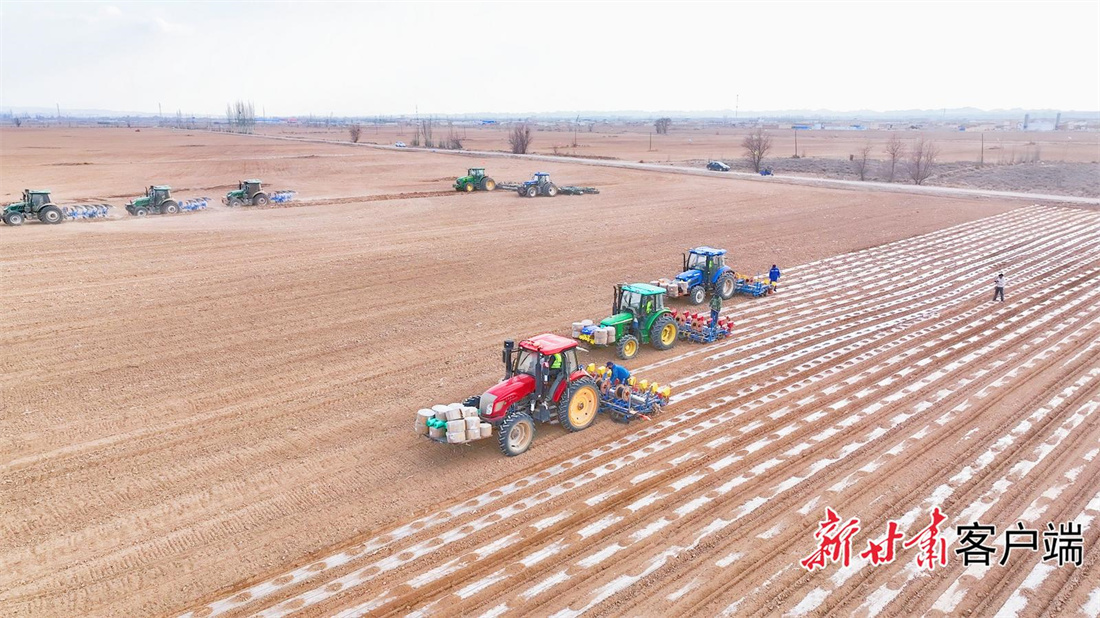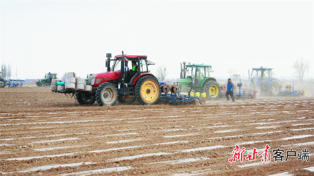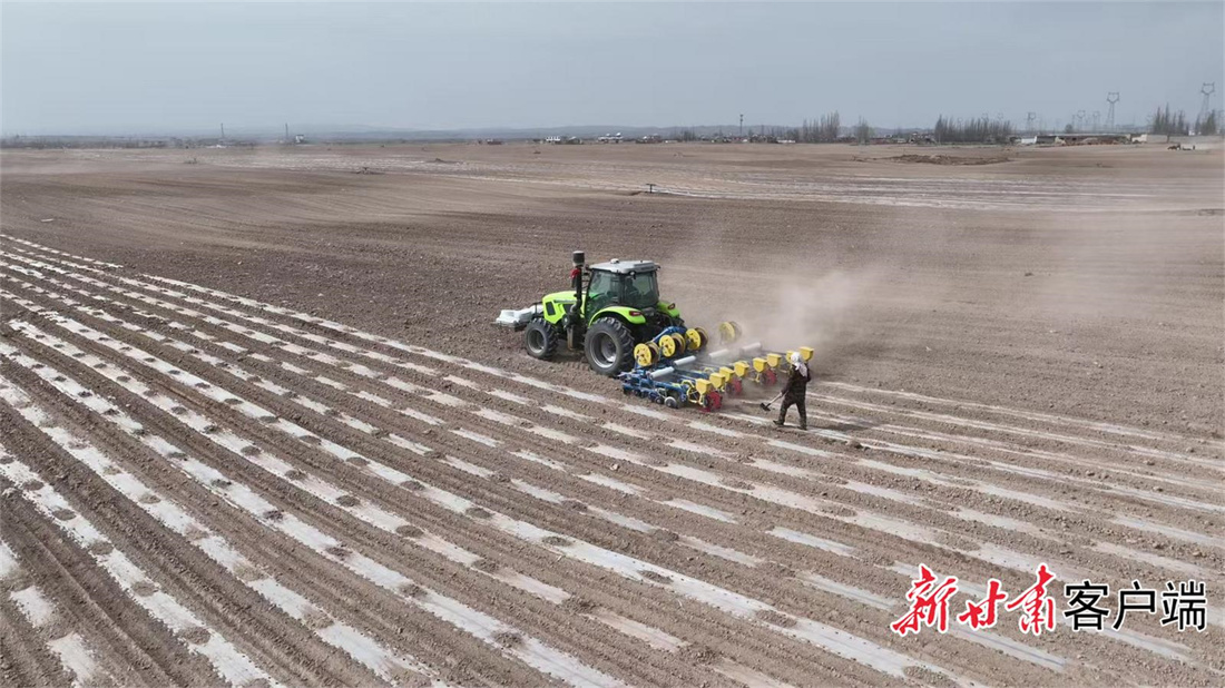 ▲大型耕种机正在高标准农田里来回穿梭,铺膜、播种、铺设滴灌带一气呵成。本文图片由新甘肃·甘肃日报通讯员 牛亮 摄