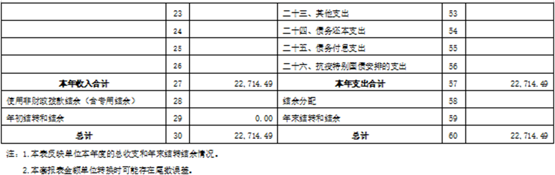 2024年度收、支总计均为22714.49万元。与上年度相比,收、支总计各减少2125.96万元,下降8.56%,主要原因是2023年的收入中包含年初结转结余6699.65万元,支出中包含年末结转结余6699.65万元,后经核对该数据存在会计差错,故2024年在填报决算时对该结转结余做调减处理,致使2024年收入支出均下降。