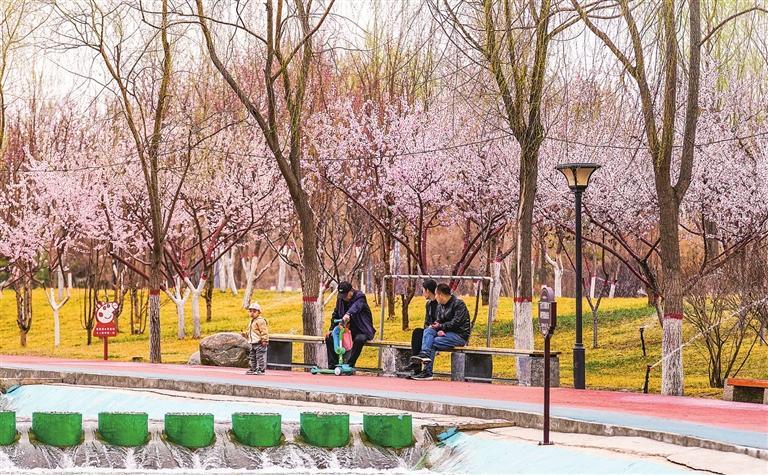 百花公园里桃花正艳,居民在桃花树下休息,享受惬意。