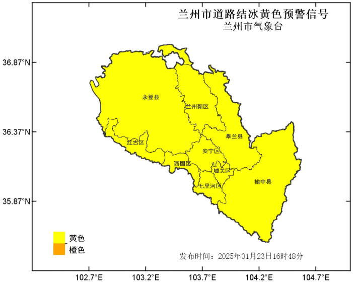兰州市气象台2025年01月23日16时48分发布道路结冰黄色预警信号:预计24至26日,受寒潮降雪天气影响,城关、七里河、安宁、西固、红古、榆中、皋兰、永登及兰州新区大部路段将出现积雪或道路结冰,请注意防范对交通安全的不利影响。