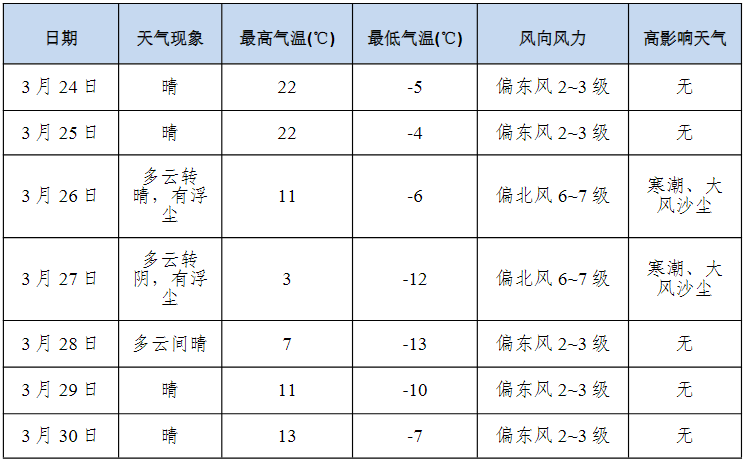 24至25日,主要受西北气流影响,新区天气以晴为主,白天气温较高;26至28日,受强冷空气影响,新区将有一次寒潮、大风沙尘天气过程;29至30日,受西北气流控制,新区天气转晴,气温回升。