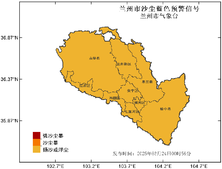 兰州市气象台2025年03月24日0时56分发布沙尘蓝色预警信号:预计今天凌晨至白天,受上游输入性沙尘影响,我市城关、七里河、安宁、西固、红古、榆中、皋兰、永登及兰州新区有浮尘天气,并伴有3~4级西北风,阵风5~6级。请注意防范!