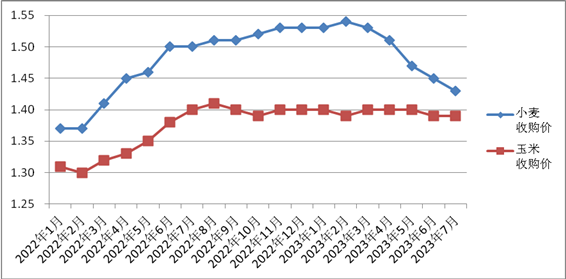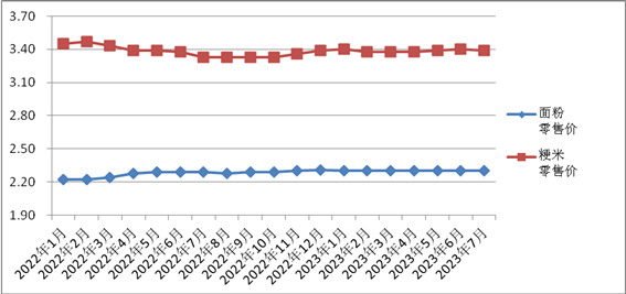 7月份,小麦、玉米平均收购价每500克分别为1.43元、1.39元,环比,小麦下降1.38%,玉米持平;与去年同期相比,小麦下降4.67%,玉米下降0.71%。面粉、粳米、菜籽油平均零售价分别为2.30元/500克、3.39元/500克、81.12元/桶,环比,面粉持平,粳米、菜籽油分别下降0.29%、0.16%;与去年同期相比,面粉、粳米、菜籽油分别上涨0.44%、1.80%、3.09%。