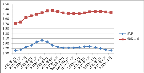 7月份,尿素、磷酸二铵、棚膜、地膜平均销售价格分别为2.61元/公斤、4.17元/公斤、13.96元/公斤、10.97元/公斤,环比,尿素、磷酸二铵、棚膜分别下降1.14%、0.24%、0.50%,地膜持平;与去年同期相比,尿素、磷酸二铵、棚膜、地膜分别下降12.12%、1.18%、3.72%、4.53%。