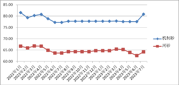 7月份,我省砂石平均出厂价格机制砂(细砂)每吨80.89元,河砂(细砂)每吨64.18元,环比分别上涨4.29%、2.61%;同比,机制砂上涨4.75%,河砂上涨0.85%。
