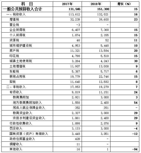 一般公共预算收入安排15.13亿元,较2017年度13.16亿元增长15%,其中:本级税收收入留成13.2亿元,增长16%;非税收入1.93亿元,增长7%。