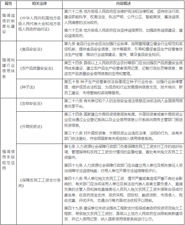 三是强调信用手段规范运用。目前设列信用条款的现行法律和行政法规均将信用手段作为推动行业领域健康规范发展的重要举措加以立法规范。在民法商法、行政法、经济法、社会法等各类法律中,涵盖诸如建立信用信息管理系统、建立主体信用记录和信用档案、依法依规实施信用奖惩等,或在金融领域中如《外商投资法》《征信业管理条例》等则对征信、信用评价等具体信用产品做出明确规范。