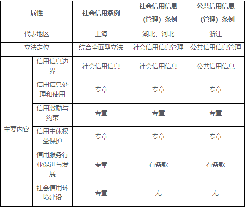 当前,我国地方信用立法实践主要存在“小法”和“折中”两种立法模式。“小法”立法模式是指对微观领域如经济、金融领域的信用行为进行法律规制,强调信用的可量化性,认为仅需规制私权利主体履约方面的经济信用。目前《征信业管理条例》和地方的“信用信息管理条例”均为该模式。“折中”立法模式是指对私权利主体和公权力主体的履约和守法等信用行为进行规制,强调要调整私权利主体的信用问题,对公权力主体的诚信问题仅做基于价值观层面的原则性规定。目前,各地“社会信用条例”均为该立法模式。总体来看,各地信用立法可分为采用“小法”立法模式的湖北、河北“社会信用信息(管理)条例”和陕西、浙江“公共信用信息(管理)条例”,采用“折中”立法模式的上海、河南、天津、山东“社会信用条例”。随着社会信用体系建设高质量发展逐步深化,信用立法更加强调基础性、综合性立法,已有17省10市出台社会信用条例,确保社会信用信息处理和使用、信用激励与约束的规则、信用主体权益保护措施、信用服务行业促进与发展、社会信用环境建设等信用工作有法可依。