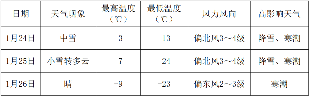 预计1月24日白天至25日,受高原槽及强冷空气影响,新区有一次较大降雪天气过程,气温明显下降;26日,转为西北气流影响,新区天气晴,气温持续下降;27至29日,受偏西气流影响,新区天气以晴为主。