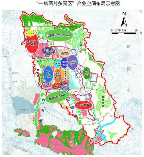 “两片”是指以上川镇和秦川镇为主体建设新区北部片区、以黑石镇、石洞镇为主体建设与主城区相向融合发展的南部片区。新区北部重点布局发展绿色化工、新材料、城市矿产和表面处理、食品粮食加工等产业。南部片区黑石镇重点发展高性能冶金、新型建材等,打造循环经济示范区;三川口工业园区发展装备制造、建材等产业集群。