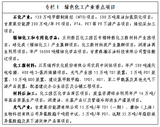 石化产业。重点从基础原料配套供应、乙烯、丙烯、c4、芳烃、裂解c5和裂解c9产业链延伸发展,并积极推动兰州石化搬迁改造,形成完善的中上游石化产业链。烯烃原料配套供应重点生产乙烯等富烯烃原料产品,同时延伸发展聚丙烯烯烃类基础产品。芳烃原料配套供应重点发展苯、甲苯、对二甲苯等基础芳烃类产品。乙烯下游产业链延伸原料以聚乙烯、苯乙烯以及特种聚烯烃为主,重点发展聚乙烯改性料、专用料的生产。丙烯下游产业链延伸原料以丙烯酸及酯、聚丙烯、丙烯腈为主。c4产业链延伸向下游发展丁腈橡胶、苯乙烯类热塑性弹性体、abs产品。芳烃产业链延伸链重点以纯苯、甲苯、对二甲苯(px)和邻、间二甲苯等芳烃下游产业链延伸为主。裂解c5产业链重点发展c5高端专用化学品和化工新材料型产品。c9产业链重点发展冷聚树脂、共聚树脂和氢化c9石油树脂等高端产品。