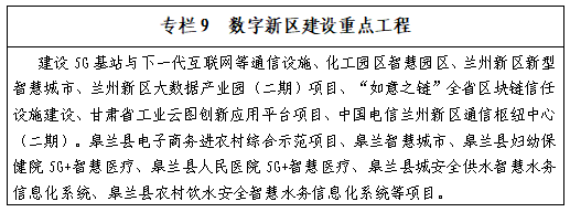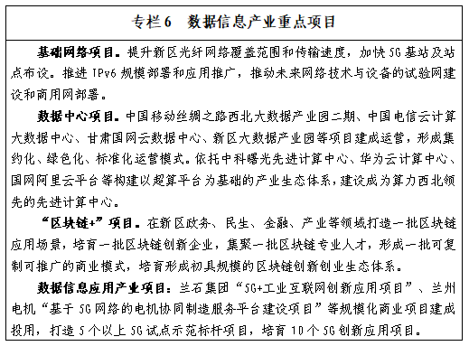 加快光纤网络的宽带化智能化建设,打造“双千兆新区”。超前布局5g、人工智能、工业互联网等新一代信息通信设施,加强通信电缆、基站等信息基础设施建设,促进大数据、物联网、云计算等信息技术与基础设施深度融合。扩大5g建设投资规模,2025年实现兰州新区5g信号全覆盖。加快推进5g在智慧城市、智慧园区、智慧医疗、工业互联网、智慧口岸、智慧物流等领域的深度应用。推动5g等网络设施与新建建筑物在初步设计和施工图阶段“四同步”,积极稳妥推动既有建筑物信息基础设施升级改造。加快建设城市智能杆及相关配套设施,推动智能杆在5g网络建设中的广泛应用。全面启动“宽带 5g 千兆wi-fi”三千兆升级,支持wi-fi6的千兆wi-fi网络建设,加快建设城乡一体化精品网络。支持对符合条件的5g基站单独装表建户,贯彻执行相关5g基站电价政策,支持参与电力市场交易。适时布局6g网络技术储备。加快推进甘肃国网云数据中心建设,打造国网首个“高效能、高密度、高容量”的大型云数据中心。