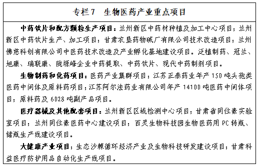 三是产业集聚效应逐步显现。紧抓中东部产业转移机遇,坚持“强龙头、补链条、聚集群”,通过政策引导、重点培育等方式,大力推进工业发展,“十三五”期间累计引进工业项目432个,总投资约1116亿元,形成了绿色化工、新材料、大数据、先进装备制造、新能源、生物医药等产业循环发展的态势。装备制造产业,引进落地先进装备制造产业项目70个。兰石、兰电、兰泵3家装备制造龙头企业2020年实现产值41.49亿元,占装备制造产业总产值的56.9%,超高温熔盐泵、超深钻机、节能电机等一批技术领先产品加速转化,2020年新区获批国家装备制造高新技术产业化示范基地。化工产业,150平方公里千亿级绿色高端化工产业园高标准规划建设,已快速成长为国内一流精细化工产品集聚地,顺利通过省级化工园区承载能力评估认定,甘肃莱安能源、鑫隆泰、康鹏威耳等龙头企业相继入驻。含氟新材料、液晶显示材料、医药中间体产品出口日本、欧美市场,项目建设创多项全省、行业新纪录。新材料产业,新引进落地产业项目57个、总投资288亿元。德福新材料、正威铜业3家龙头企业2020年实现产值145亿元,占新材料产业总产值的95.4%,助推甘肃由原材料大省向新材料强省转变,兰州新区成功获批西北地区唯一的有色金属期货交割库。生物医药产业,累计落地生物医药企业30多家,总投资142亿元。佛慈、和盛堂、普安康、兰药等龙头企业2020年实现产值超13亿元,占生物医药总产值比重为95%,医药中间体、中成药、化学药、动物疫苗、医疗器械、医药物流等生物医药产业全产业链发展,佛慈荣获“中国中成药行业企业出口十强”。大数据产业,引进落地中国移动及中国电信idc数据中心、国网云数据中心等大数据信息化产业项目27个,总投资310亿元。建成国际互联网数据专用通道,中科曙光、华为、国网云等29家大数据企业入驻新区,兰州新区入选“国家新型工业化产业示范基地(大数据)”。新能源汽车产业,兰州广通、兰驼、建投、亚太等一批新能源汽车生产企业相继建成投产,形成新能源乘用车、专用车、商用车、客车、物流车等集聚发展态势,累计推广应用新能源汽车6万多辆,广通新能源汽车“走出国门”。