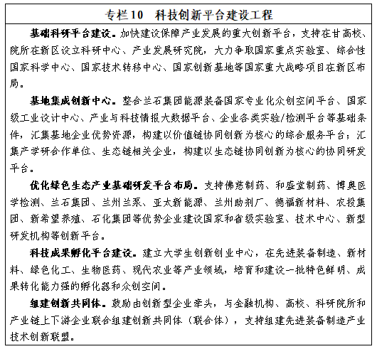 二、引进培育科技创新平台。争取建设一批国家和省级产业创新中心、技术创新中心、工程研究中心、新型研发机构等科技创新平台。支持企业与高校、科研院所和产业链上下游企业联合组建创新共同体,加强科技联合攻关,集中攻克一批前沿技术,创造更多弥补短缺、替代进口、国际领先的拳头产品。支持和鼓励省属科研机构、高等院校向新区搬迁或在新区设立分支机构。支持高校和科研院所与新区重点企业设立新型研发机构,搭建科研试验、中试、检验检测、技术转移、产业化应用等平台,推动技术熟化、知识产权运营与科技成果转化。支持德福新材料、佛慈制药、兰石集团等优势企业建设和完善国家级企业技术中心、重点实验室、省级或区域制造业创新中心,促进科技成果转化和服务行业技术攻关。建设特种设备、计量仪表检验检测中心等公共创新服务平台。