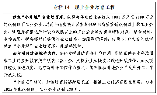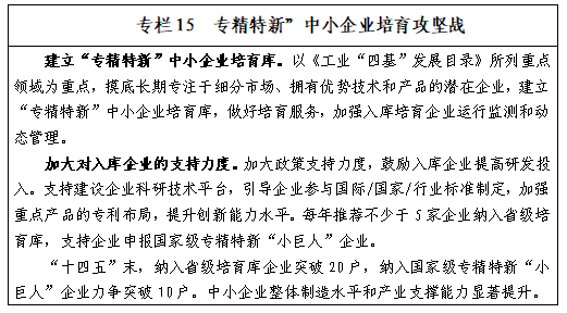 三、培育“专精特新”企业。紧扣绿色化工、新能源、先进装备制造、生物医药、数据信息和城市矿产与表面处理等产业,培育拥有核心技术和拳头产品、服务于制造业核心基础零部件、先进基础工艺和关键基础材料等细分产品市场的“专精特新”企业,打造细分领域“行业小巨人”。健全精准有效的财税支持机制,发挥创业投资市场作用,加快中小企业上市培育,积极推行企业债券融资,完善融资担保机制,解决中小企业融资难题。建立“专精特新”企业培育库。推进培育企业“规下转规上”。设置“专精特新”企业评价体系,提供差别化的分类指导、精准服务,促进企业提质增效。充分发挥“不来即享”等各类公共服务平台网络联动优势,整合社会中介服务资源,提供创业辅导、培训咨询、社保代理、财务管理、法律咨询、服务担保、市场营销等规范化、精细化、个性化服务。引导大企业结合产业链、供应链、价值链、创新链为中小企业提供配套服务。鼓励各类社会组织为企业提供公益性服务,探索建立志愿服务机制。到2025年,培育形成30个“专精特新”小巨人企业,引导100个成长性好的小企业“规下转规上”。