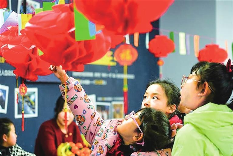 你折纸我安装、你涂胶水我贴花,再装好发光灯泡……瑞岭社区的孩子们跟着志愿者学习制作花灯。大家三两组队,齐心协力,不一会儿,一个个精致的花灯便呈现在大家眼前。“看,这是我们亲手做的花灯,多漂亮!”孩子们开心地说。