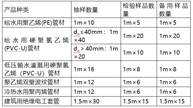 每类产品抽取样品二组,其中一组作为检验样品,另一组作为备用样品,抽样数量见表1。