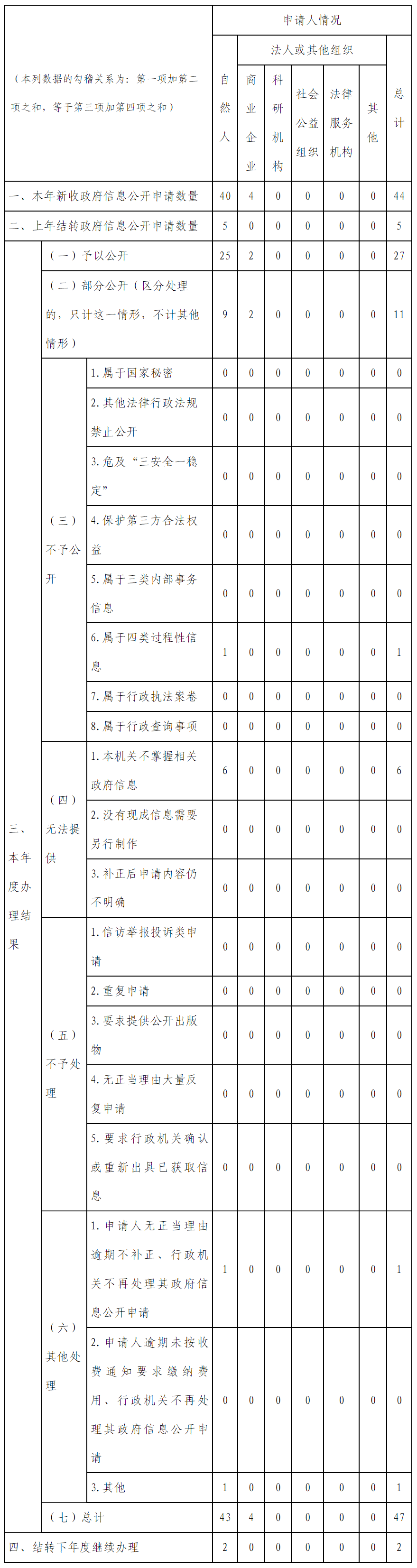 (二)规范办理依申请公开事项。进一步规范依申请公开事项的受理、办理和回复程序,对收到的政府信息公开申请实行台账式管理,建立了业务科室办理,办公室登记、分办、督促的办理机制,确保按照法定时限和程序做出答复。全年受理政府信息公开申请44次,均按时依法进行了答复。答复网民留言39件、民情通145件,及时回应民众诉求,优化部门形象,防止矛盾积累上行,充分保障人民群众合法权益,优化了部门形象。