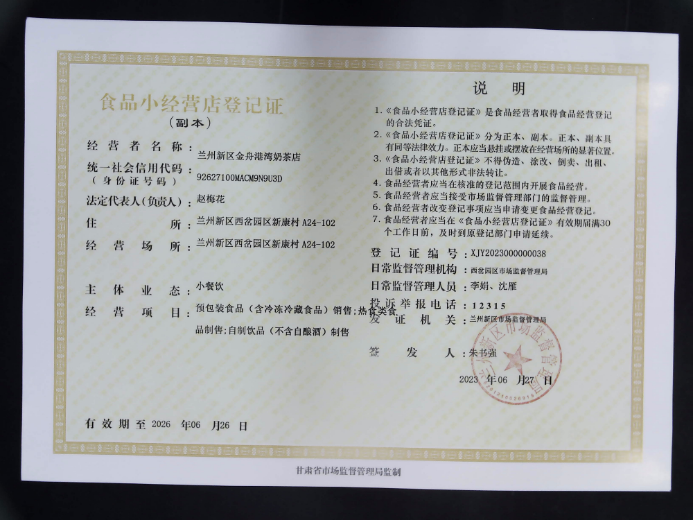兰州新区金舟港湾奶茶店食品经营许可证-捕鱼网