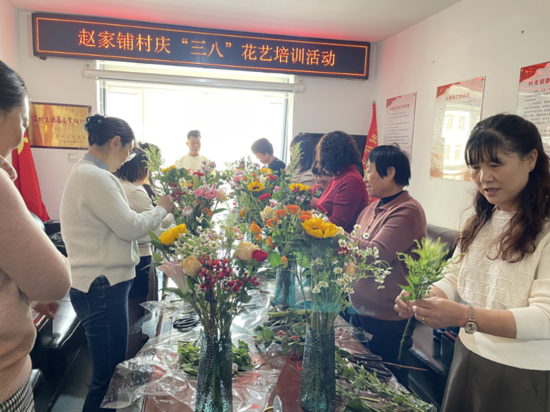 “大家在插花的时候,要错落有致,按照上轻下重的原则,将颜色浅的插上面,颜色深的插下面,花苞插上面,盛开的花插下面。”在赵家铺村的村委会,插花老师正在给学员讲解插花的知识。为庆祝三八国际妇女节的到来,赵家铺村妇联组织20余名妇女开展了“三八”花艺培训活动,活动中各位妇女学习了插花的技艺,同时赵家铺村妇联以花喻人致敬妇女给他们送去节日的问候,愿她们像向日葵一样积极向上充满活力,像玫瑰一样美丽动人,像小雏菊一样永葆童心开心快乐。