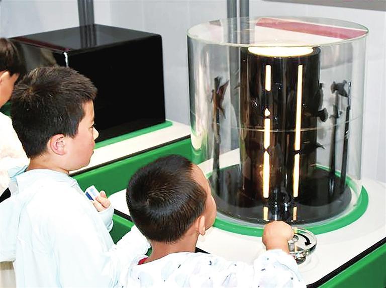 “‘镜面立方体’主要由平面镜、彩条及led展示板组成,在‘视觉暂留’和闪光灯的共同作用下,小朋友便会看到一幅幅定格图像形成小人行进的连贯动作。”工作人员介绍。