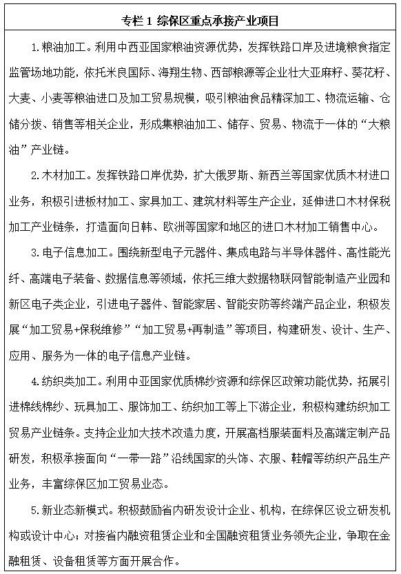 依托兰州新区综合保税区打造加工贸易“核心区”,以承接产业转移为着力点,以结构调整和产业升级为主攻方向,以建设“加工制造中心”为目标,因地制宜承接境内外加工贸易产业转移,重点吸引“有技术、有品牌、有市场”的龙头企业和战略投资者兴办加工贸易企业,力争打造“保税 ”产业基地。引导加工贸易企业向综保区集聚,立足综保区现有粮油、木材、电子加工等产业,加快引进食品精深加工、纺织服装、家具生产、高端电子制造等项目,加快产业规模化集聚,做大做优综合保税区主导产业。