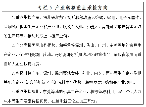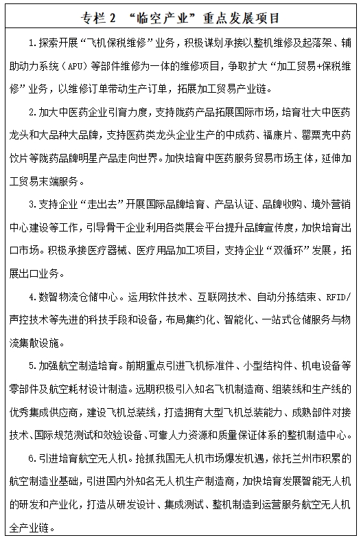先进制造业方面。立足兰州新区制造业产业基础,积极融入国家中医药产业发展综合试验区建设,依托甘肃道地中药材资源和医药科研优势,紧抓国家中医药产业发展综合试验区机遇,重点承接现代中药、生物制药、化学制药、食品保健、美妆护肤、医疗器械设备等生物医药产业相关项目。加快发展与大数据、人工智能、物联网、智能制造等紧密结合的航空高端制造产业,构建智能制造产业智慧供应链集成服务平台,推动先进制造业与航空运输业协同发展。大力引进航空关联领域先进制造企业,重点培育发展航空仪器仪表、精密航空轴承、机场专用先进设备、智能成套专业装备、通讯终端等先进制造业,加快形成以兰州国际空港为载体、工业互联网为依托的先进制造产业生态,打造西北智能制造产业发展高地。