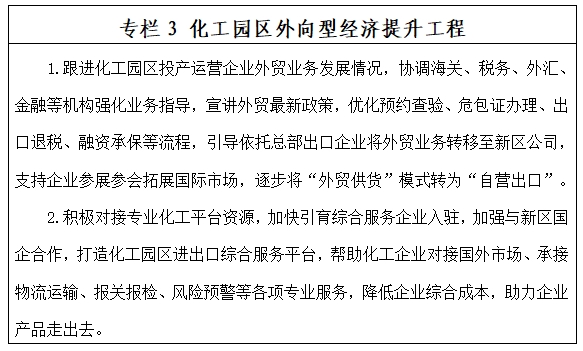 合理规划各园区功能板块,强化产业链集聚能力,持续提升综合保税区、绿色化工产业园、食品加工产业园、生物医药产业园、新材料产业园、装备制造产业园等园区加工贸易产业承载能力。创新加工贸易新业态新模式,推动“加工贸易 电商”“加工贸易 再制造”“加工贸易 生产服务”“加工贸易 研发设计”“加工贸易 品牌创建”等业务加速集聚,逐步优化现有加工贸易产业结构,推动相关产业提升附加值和竞争力。