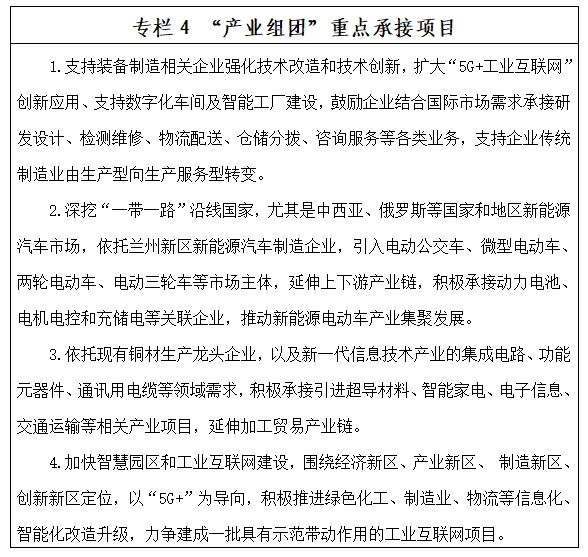 (三)数据信息产业组团。依托兰州国家级互联网骨干直联点,加快中国电信大数据中心二期、中国联通数据中心、润泽国际信息港、重离子治癌智能医护平台等项目建设,发展集智能设备研发生产、数据存储运算、软件开发集成为一体的数据信息产业链,引进人工智能、智算中心等战略性新兴产业项目,加快构建“智算 超算 边缘计算”多元算力支撑体系,助推工业互联网规模化应用、产业数字化转型。积极承接数据信息研发生产、数据存储运算、软件开发集成等相关项目,支持信息技术与装备制造、现代农业、新能源新材料等特色优势产业深度融合。加快引进大数据关联产业、大数据服务链、工业大数据与信息化、重点行业大数据等领域项目,助推加工贸易数字化、智能化升级。