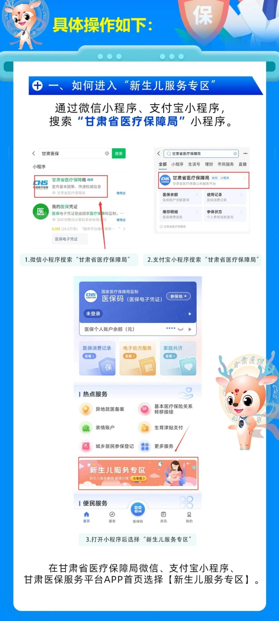 “新生儿服务专区”已接入甘肃省医保局微信和支付宝小程序、甘肃医保服务平台app。新生儿父母只需登录以上任一平台,进入“新生儿服务专区”,按照提示操作即可完成相关业务办理。