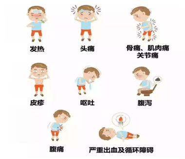 发烧(可达39℃):发烧是感染登革热之后最常出现的症状,并感觉十分疲惫,有时还会出现厌食、恶心、肚子疼、腹泻等症状。
