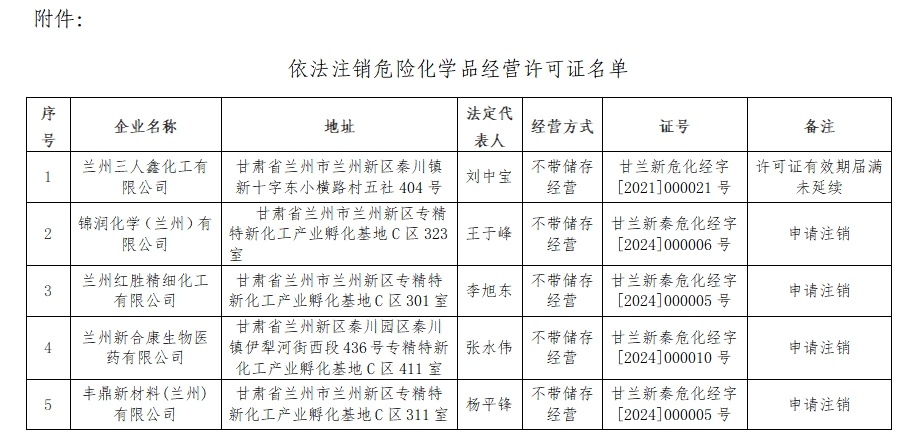 截至2024年7月29日,由于我园区1家企业的《危险化学品经营许可证》(见附件)有效期届满未延续,4家企业因为企业自主申请注销,依据《中华人民共和国行政许可法》第七十条第(一)项、《危险化学品经营许可证管理办法》(原国家安全监管总局令第55号)第二十七条第一款第(一)项、第(二)项的规定,决定对兰州三人鑫化工有限公司、锦润化学(兰州)有限公司、兰州红胜精细化工有限公司、兰州新合康生物医药有限公司、丰鼎新材料(兰州)有限公司《危险化学品经营许可证》依法予以注销。