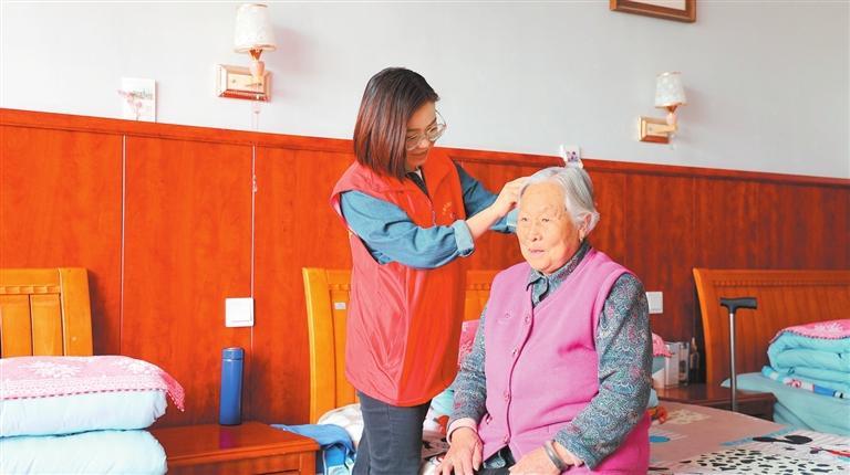 定西市安定区中华路街道火车站社区志愿者在老年养护院探望孤寡老人。(通讯员王颖)