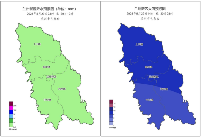 图1:5月29-30日兰州新区降水预报 图2:5月29日兰州新区大风沙尘预报图