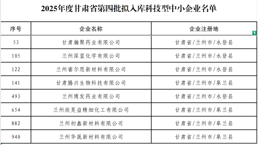 近日,省科学技术厅公布了《关于公示2025年度甘肃省第四批拟入库科技型中小企业名单的通知》,兰州新区专精特新化工产业孵化基地8家企业成功入围名单。