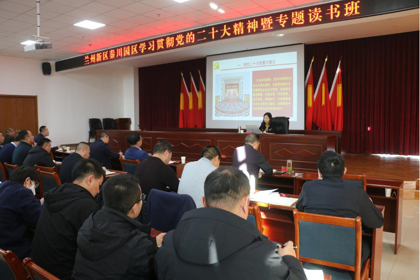 1月29日,兰州新区秦川园区举办学习贯彻党的二十大精神暨专题读书班,秦川园区党委书记朱宗斌做开班动员讲话。随后,邀请党的二十大代表、省委党校(甘肃行政学院)专家分别围绕学习贯彻党的二十大精神和省第十四次党代会精神、省委经济工作会精神进行了专题辅导。园区党委、管委会班子成员,园区全体干部近300人参加。